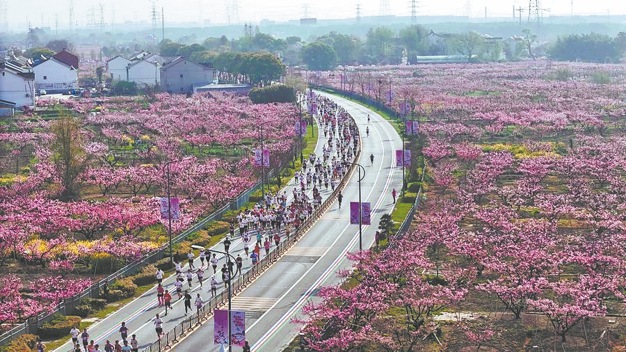 НАНДЖИН — В една весела пролетна сутрин хиляди бегачи с ризи с мотиви от прасковен цвят създадоха море от розово, тръгвайки по 10-километрово трасе, криволичещо сред прасковени овощни градини, селски къщи и меката светлина на сезона.