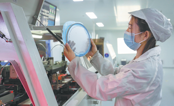 Техник инспектира опаковката на полупроводникови чипове в Binzhou, провинция Шандонг, на 28 януари. GUO ZHIHUA/ЗА КИТАЙ ДАЙЛИ