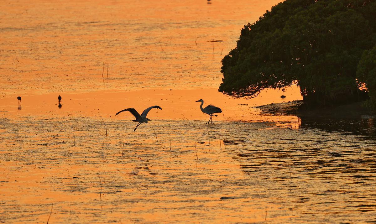 Птиците се събират край мангровите гори и бреговата линия при залез слънце в квартал Футиен в Шенжен. [By Hu Liuliu/for chinadaily.com.cn]