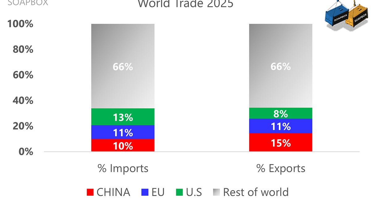Графиката обяснява защо тарифната политика често ескалира бързо. При 13% от глобалния внос САЩ могат да навредят на чуждестранните износители, като облагат с данъци достъпа до американския пазар. С 15% от световния износ Китай е по-уязвим, когато други блокират, облагат или пренасочват търсенето от китайски стоки. ЕС е приблизително балансиран на 11% както от вноса, така и от износа, но често се превръща в вторичен пазар, тъй като отклонените стоки и допълнителната конкуренция попадат в Европа.