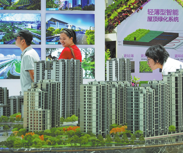 Посетител (вдясно) разглежда модел на проект за недвижими имоти на Китайския международен панаир за търговия с услуги през 2025 г. в Пекин на 12 септември. TANG KE/ЗА КИТАЙ ДАЙЛИ