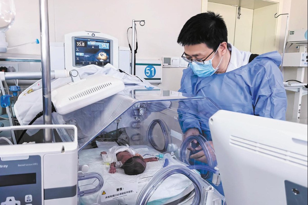 Тиан Конглианг от присъединителната болница на Медицинския университет в Далиан проверява статуса на новородено в отделението за интензивно лечение на новородени в Народната болница на град Нагку в Нагку, автономен регион Ксизанг, през юли. [Photo provided to CHINA DAILY]