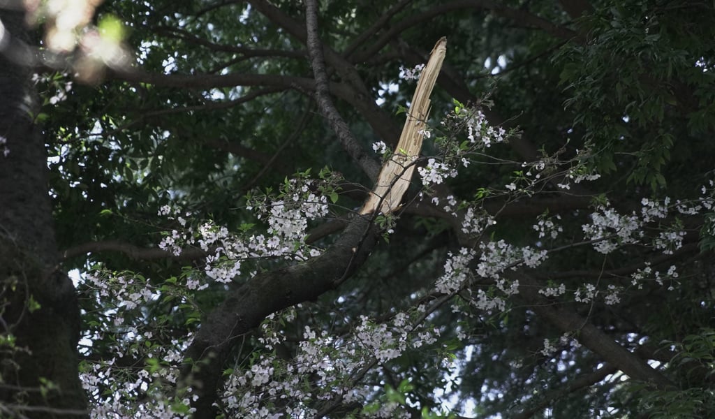Счупен клон е захванат от повредено черешово дърво, след като близко дърво падна върху него в парка Кинута в Токио в петък. Снимка: AP