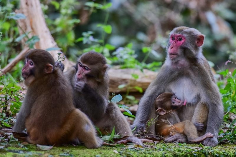 Виждат се диви макаци резус в природния резерват Гуаншан в провинция Дзянси в Източен Китай, 1 октомври 2017 г. [Photo/Xinhua]