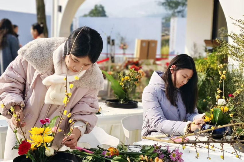 Село Сусин в квартал Бейбей в Чунцин е домакин на 8-ия конкурс за традиционно аранжиране на цветя Jingguan Cup на 11 януари 2026 г. Участниците демонстрират сложната естетика на източния флорален дизайн чрез аранжировки от чимонантус. [Photo provided to chinadaily.com.cn]